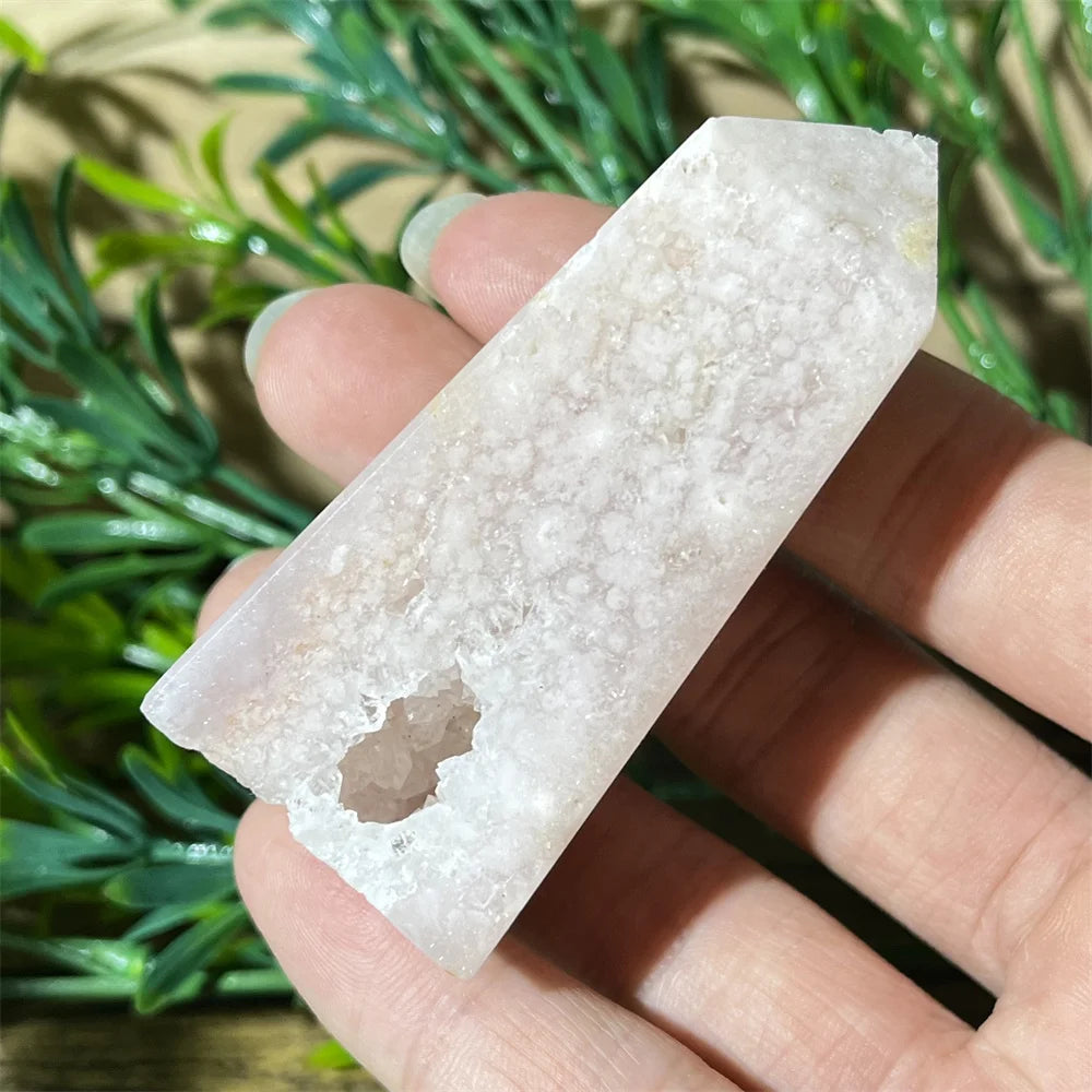 Color: Soft pinks, creams, and translucent whites with natural druzy sparkle